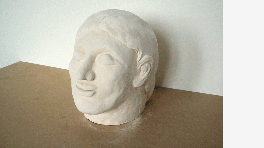 A sequence showing the workflow used to create the projection: clay sculpture, digitalised version, 3D-printed resin object and projected image.