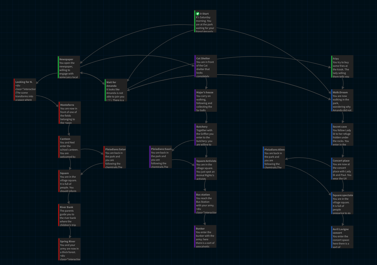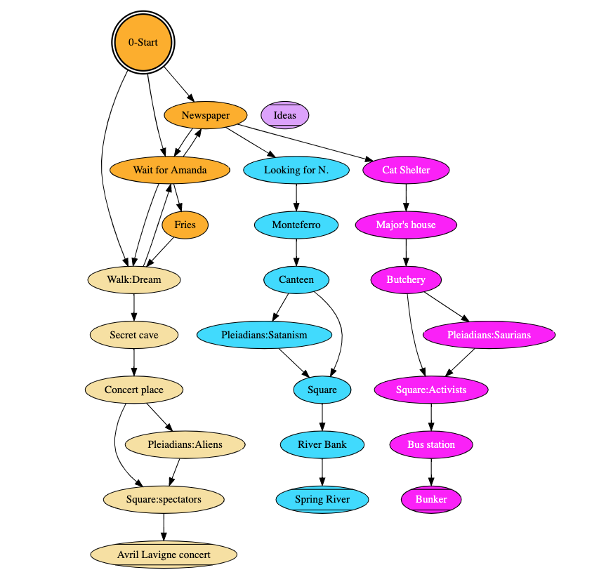 The game employs a fictional lens to ultimately unravel the links and sources to real events and anecdotes related to the conspiracy theories universe. In parallel with the theoretical inquiry, I conducted a research into gaming workframes, ending up crafting a game engine of its own, following the storytelling needs. This results in a combination of a game, interactive fiction, digital book and theoretical essay.